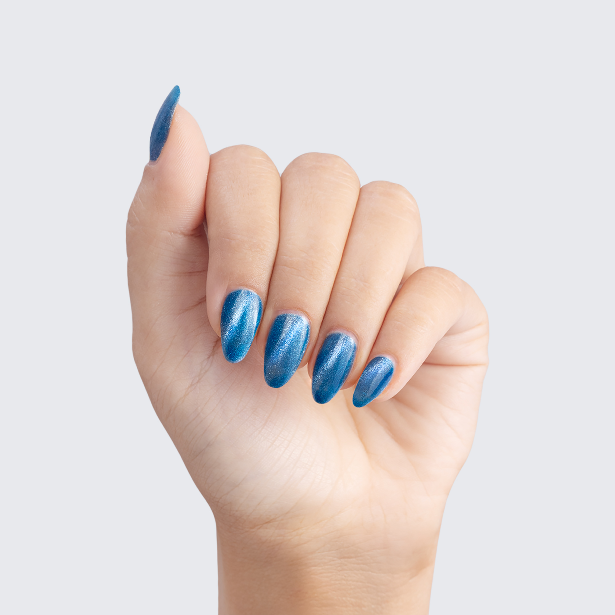 Cobalt blue. Dark. Light blue magnetic shimmer. Opaque. Cool undertone.
