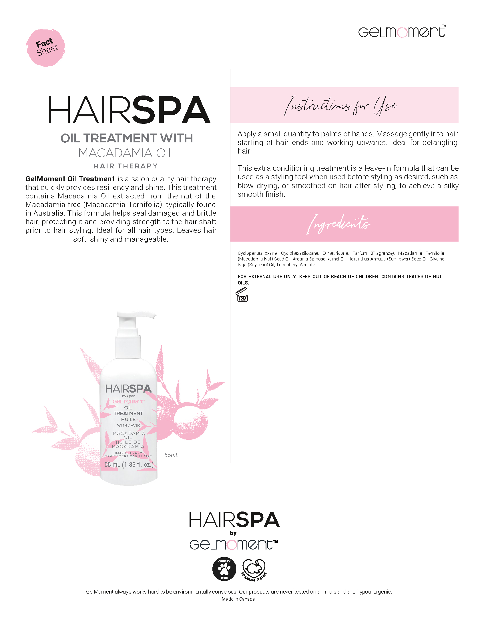 Salon quality daily hair therapy for softer, silkier and more manageable hair. GelMoment’s SLS & Paraben free Macadamia  Shampoo brings back lustre and shine to your hair while removing build-up, stubborn residue, and excess oil. Our pH-balanced formula tames frizz and tangles while smoothing split ends. Gently cleanses and hydrates hair leaving it silky, manageable and easier to brush!